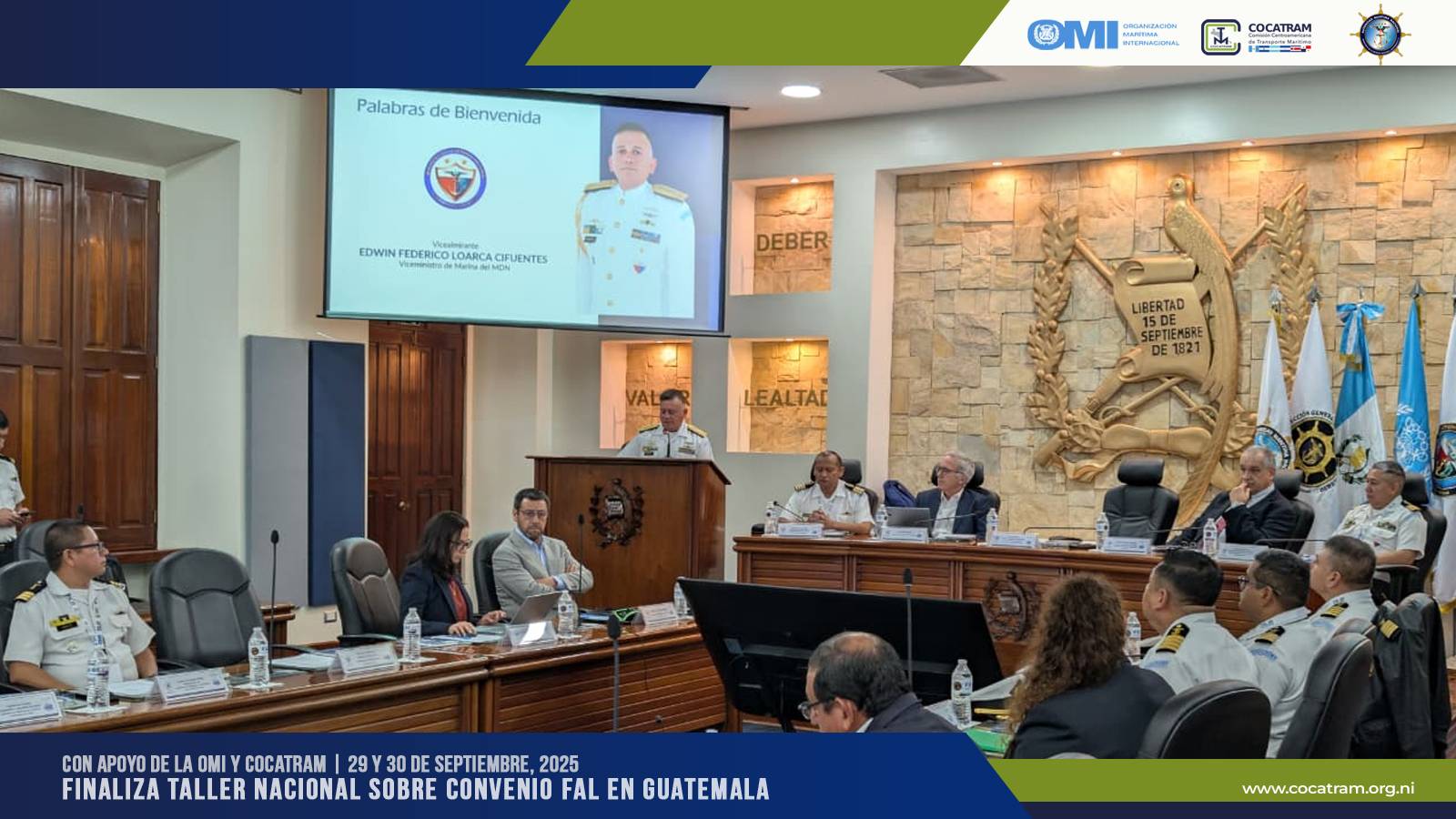 Durante el taller, se contó con la presencia del Viceministro de Marina del MDN, Edwin Loarca Cifuentes; el Director Ejecutivo de COCATRAM, Otto Noack; y con el valioso acompañamiento técnico del Jefe de la Sección de Facilitación de la OMI, Julián Abril, y el consultor OMI Marcelo Albarrán, de Chile.