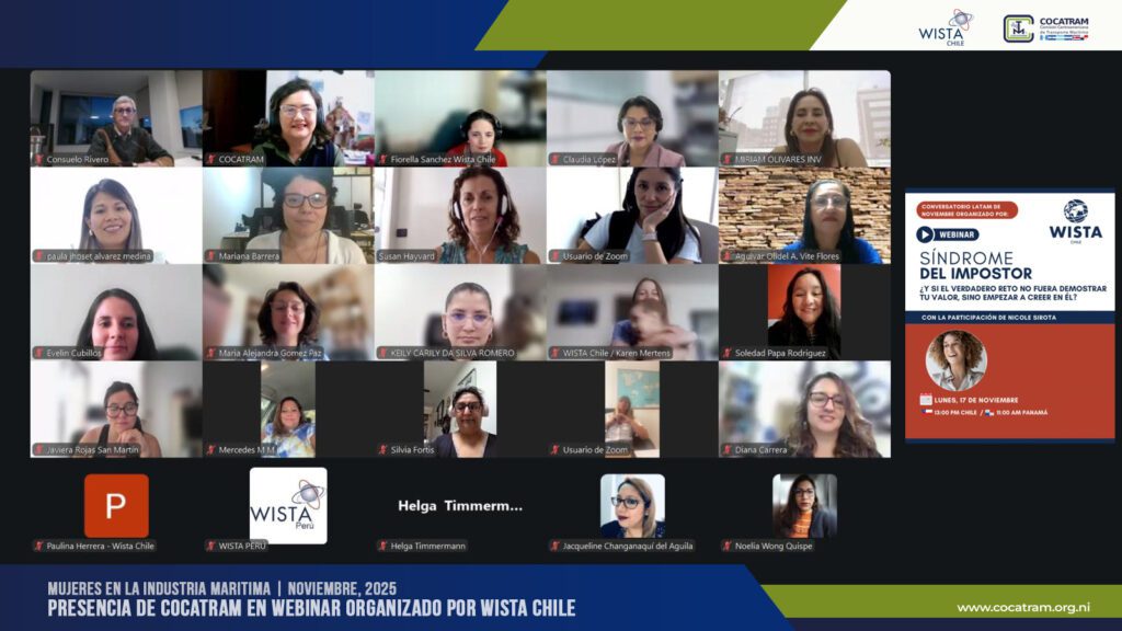 La Comisión Centroamericana de Transporte Marítimo (COCATRAM) participó en el primer Webinar para Latinoamérica del ciclo 2024–2025 organizado por WISTA Chile, espacio que abordó el Síndrome del Impostor y su impacto en el desarrollo profesional de las mujeres que se desempeñan en el sector marítimo-portuario.